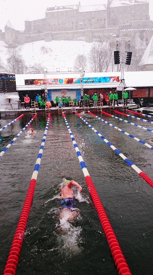 Am vergangenen Wochenende wurden neben den offiziellen Weltmeisterschaften auch die 3. Ice Swimming German Open unterhalb der längsten Burg Deutschlands im Burghausener Wöhrsee ausgetragen. Unter die rund 300 Teilnehmer aus 26 Nationen mischte auch der Braunauer Clemens Duft, der für den TV Passau 1862 an den Start ging, erfolgreich mit. Über 500 m Freistil qualifizierte er sich in 7:44,4 Minuten für das Superfinale der besten acht Schwimmer. Bei Schneefall, einer Lufttemperatur von ca. -8 Grad und einer Wassertemperatur von +2,4 Grad mussten starke Umwälzpumpen den Wöhrsee eisfrei halten. Die Härte für dieses Schwimm-Meeting holte sich Clemens Duft bei seinem fast täglichen Training im eisigen Inn.